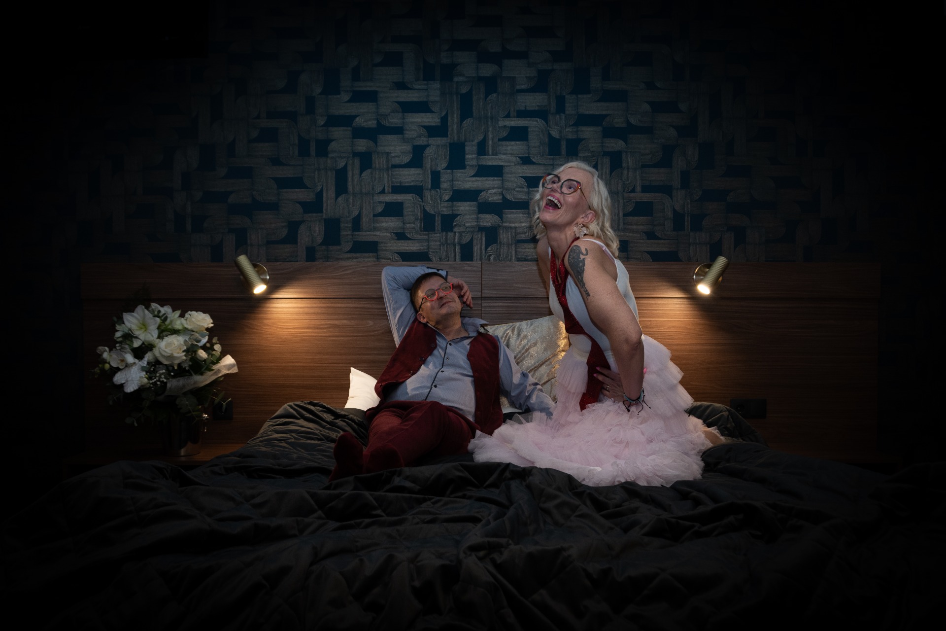 Teadagi olid mõlemad osapooled teki all riietes ja neil oli seal ikka üsna palav. Isegi minul oli. Lisavälguga 3h toimetamist (kaamera ja objektiiv lisaks) - omaette võimlemine. Võtsime siis tekki, riideid vähemaks (pildistatavatel) ja kasutasime ära Annely mängulisust. Üks lause inspiratsiooniks: "Kõige bravuursem naer". Üks kaader sellest sai tehtud.